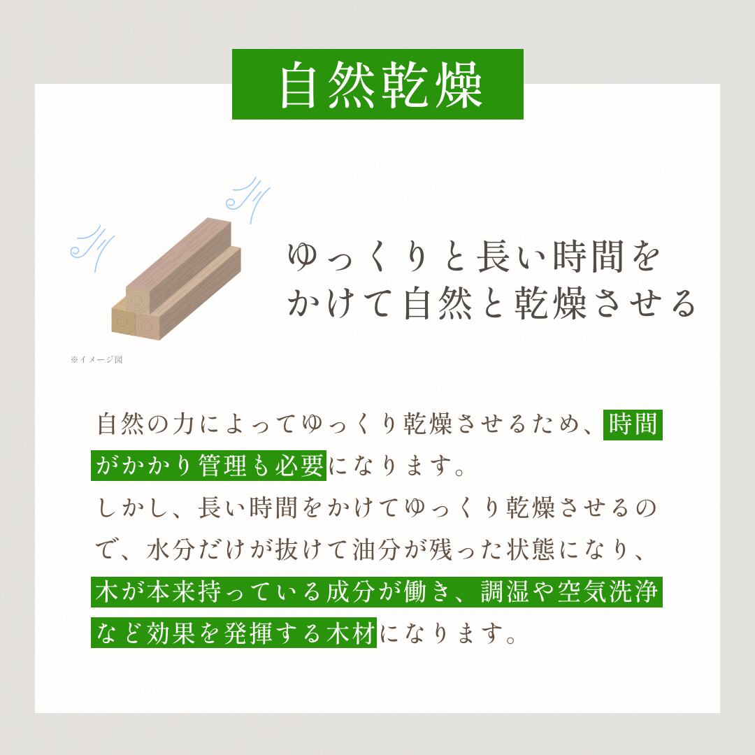 木は、ただ自然素材だから良いのではなく、乾燥方法や切り出し方によって性質が変わる繊細な素材です。