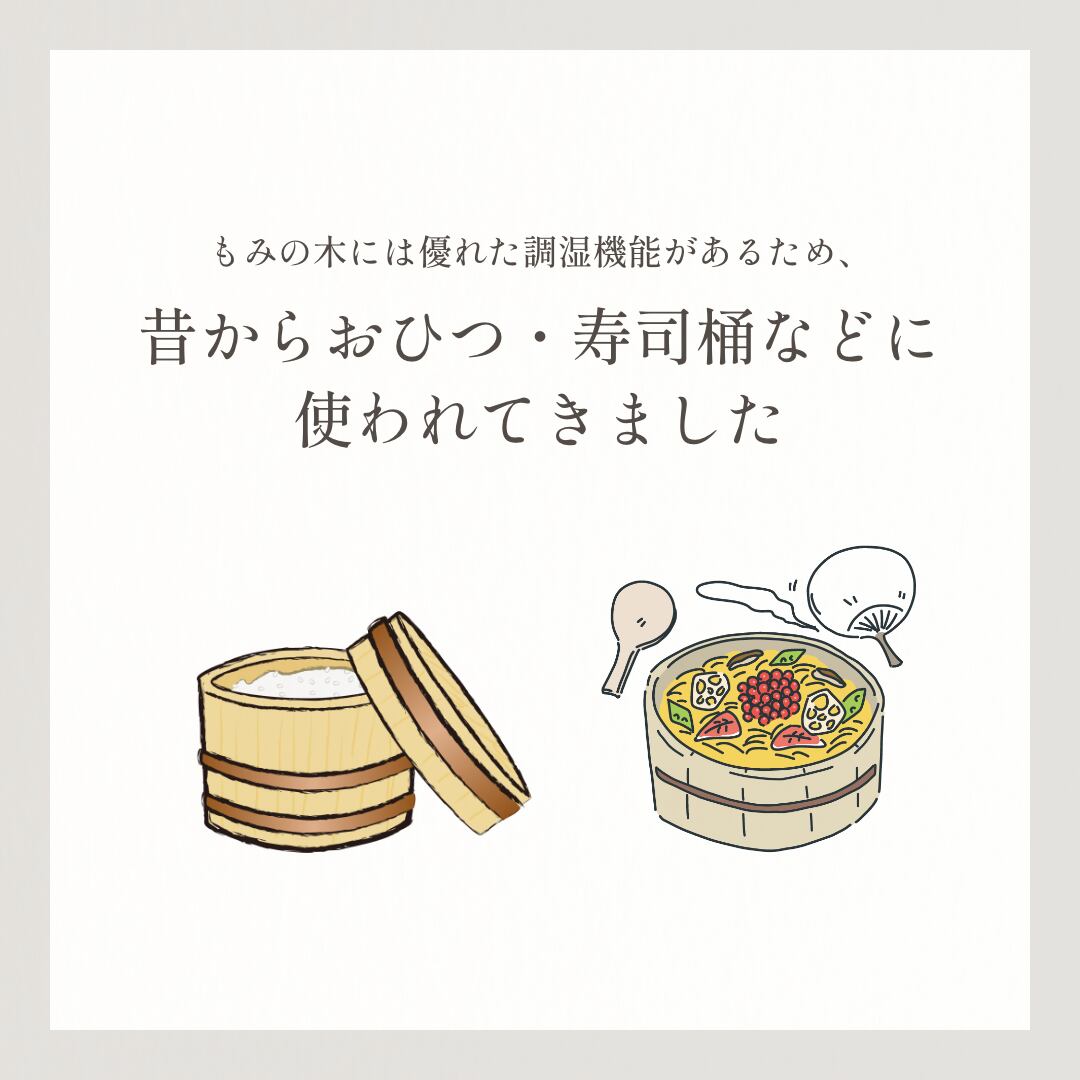 また、その調湿機能を活かし、昔からおひつ・寿司桶など食品の水分を調節したい部分で使われてきました。
