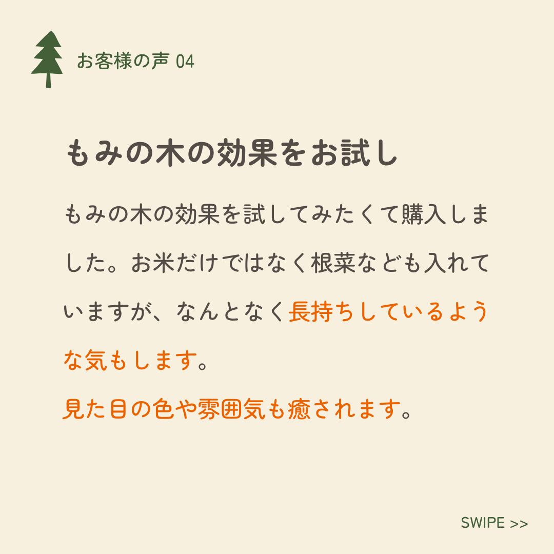 常温保存でも、もみの木の調湿効果が中の湿度を調湿してくれるので、お米の鮮度を保ったまま長期保存するのに向いています。
