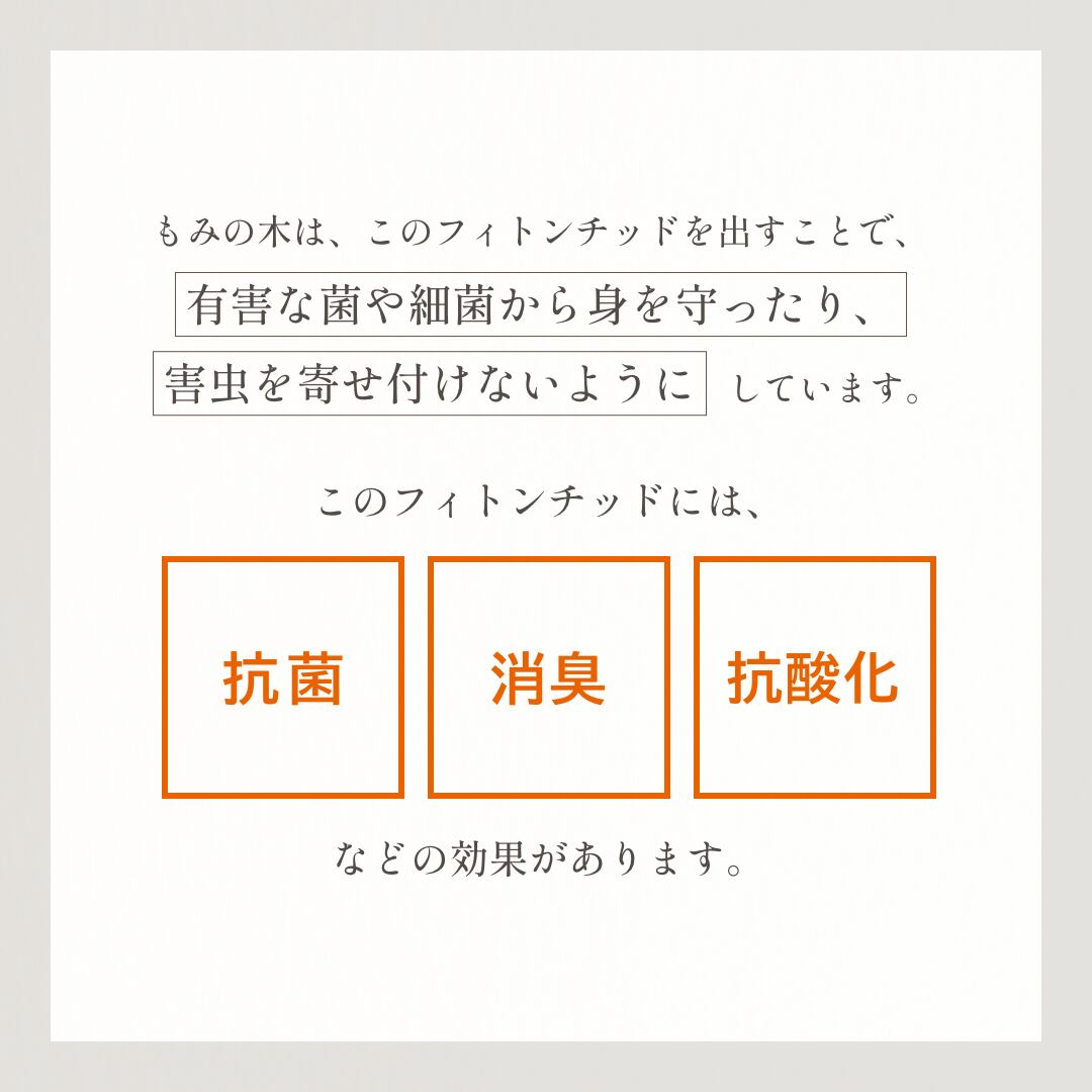 もみの木には「抗菌」「抗酸化」「消臭」などの効果がありつつも、人体には影響のない程度のフィトンチッドが含まれています。